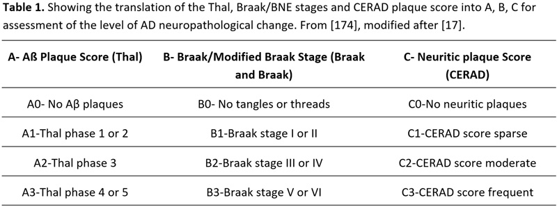 Figure 8. Pathway of the combination of different pathological features that allows a classification of ADNC according to the NIA-AA guidelines. A comparative study of clinical and neuropathological diagnoses of AD in three epidemiological samples reported a sensitivity for probable AD of 93% [238]. Meta-analysis of 20 (out of 1,189) studies to distinguish autopsy-verified AD from other dementias or healthy controls showed a sensitivity of 85.4% (95% CI 80.8-90%) and a specificity of 77.7% (95% CI 70.2-85.1%). Values were higher for neuroimaging procedures and slightly lower for CSF biomarkers, while the combination of both resulted in better results [239]. 3. Pathobiological subtypes of AD