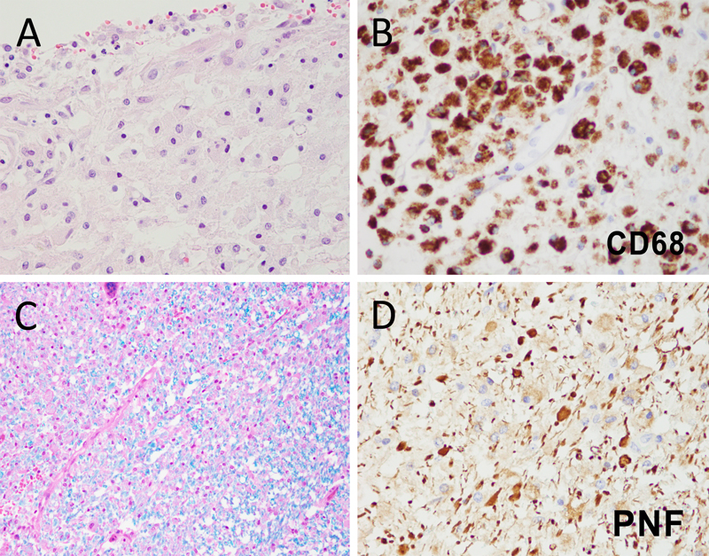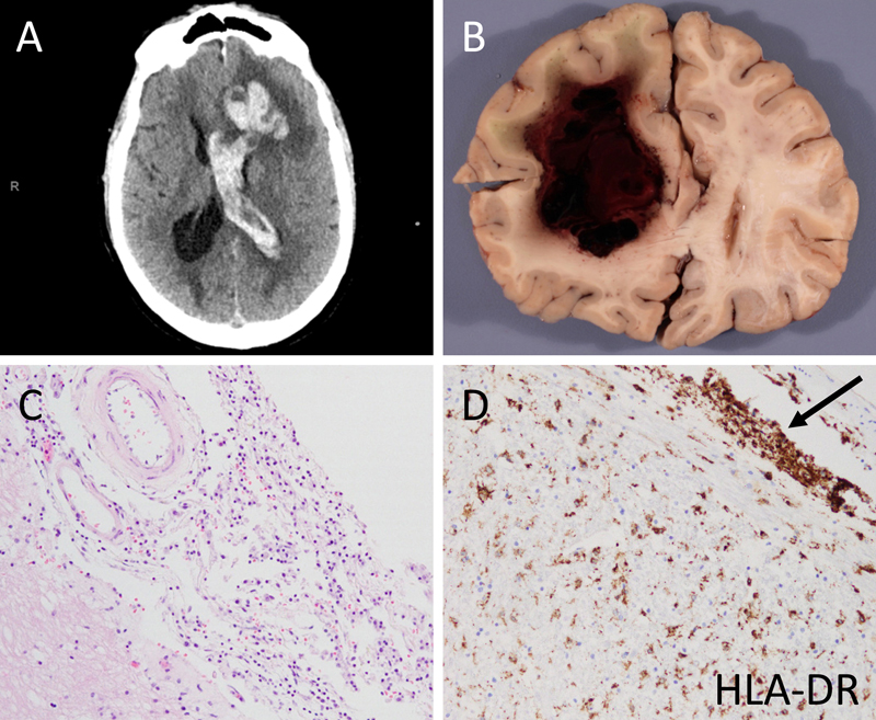 Abstract Infection with the SARS-CoV-2 virus affects a wide range of systems. Significant involvement of the central nervous system has been described, including ischemic and hemorrhagic strokes. Thus far, neuropathologic reports of patients who passed away from COVID-19 have generally described non-specific findings, such as variable reactive gliosis and meningeal chronic inflammatory infiltrates, as well as the consequences of the infection’s systemic complications on the brain, including ischemic infarcts and hypoxic/ischemic encephalopathy. The neuropathological changes in patients with COVID-19 and large hemorrhagic strokes have not been described in detail. We report the case of an elderly male who had a long course of COVID-19 and ultimately passed away from a large intracerebral hemorrhage. In addition to acute hemorrhage, neuropathologic examination demonstrated non-specific reactive changes and chronic periventricular lesions with macrophagic and perivascular lymphocytic infiltrates without evidence of demyelination or presence of SARS-CoV-2 by PCR test. This manuscript expands the spectrum of reported neuropathological changes in patients with COVID-19. Introduction Intracerebral hemorrhage (ICH) is an uncommon complication of infection with severe acute respiratory syndrome coronavirus 2 (SARS-CoV-2) virus, affecting 0.5-7.9% of patients hospitalized with COVID-191–3. Therapeutic anticoagulation has been identified as the most common etiology1–3 and an important risk factor for ICH in COVID-194. In addition, other factors such as micro- and macrovascular thrombosis, endothelial dysfunction and endotheliitis may play important pathogenic roles in this setting. Despite this plethora of hypothesized factors, only a few neuropathological reports have included detailed histopathological brain evaluations of COVID-19 patients with large fatal ICH. Post-mortem neuropathological evaluation of patients with COVID-19 have shown a range of histological changes and have been reviewed elsewhere5,6. The vast majority of cases show relatively mild and non-specific findings including variable and diffuse micro- and astrogliosis, and mild parenchymal and leptomeningeal infiltration by chronic inflammatory infiltrates, which could represent the histological features of an encephalopathy associated with severe systemic inflammation rather than specific COVID-19-related changes7. In addition, many cases show variable hypoxic-ischemic encephalopathy, infarcts associated with large vessel thromboembolism and variable hemorrhagic lesions from microhemorrhages to fatal ICH5,6. Only three detailed neuropathological reports of patients with large ICH have been published to date and include a case of cerebellar hemorrhage thought to be most likely secondary to hypertensive vasculopathy8, one of hemorrhagic transformation of a large middle cerebral artery stroke9 and two cases reported by the authors as ICH in the context of lymphocytic panencephalitis, meningitis and diffuse petechial hemorrhages10. In the latter, no details are provided regarding the histological changes associated with, or the etiopathogenesis of, the ICH or petechial hemorrhages. In this report, we expand on the neuropathological literature of COVID-19 cases by detailing the neuropathological findings in an elderly male with COVID-19 and fatal ICH. Some of the findings reported in this case were also seen in a younger individual with COVID-19 and fatal ICH for which we were unable to acquire consent for publication of clinical details. The histological similarities and differences between these two cases will be highlighted in the text. Case presentation This male patient, in his early 70s, presented to hospital with bilateral pneumonia secondary to COVID-19 infection that was confirmed by nasopharyngeal swab testing. Parallel testing for Influenza A, B and Respiratory Syncytial Virus were negative. His prior medical history included hypertension and significant hip osteoarthritis. He was diagnosed with septic shock and transferred to the Intensive Care Unit upon admission as he required vasopressors and mechanical ventilation. His mean arterial pressure was targeted to more than 65 mmHg while his systolic blood pressure (SBP) was kept below a ceiling of 180 to 200 mmHg to avoid ischemic brain injury. This was especially relevant in the context of his shock syndrome and prior history of hypertension. Only two SBP episodes over 180 mmHg, both of less than 30 min in duration, were recorded 4 and 19 days prior to his terminal ICH. During his first week of admission, he developed renal failure, which was thought clinically secondary to acute tubular necrosis in the context of multisystem organ failure. He was placed on continuous renal replacement therapy (CRRT) one week after admission. This required local anticoagulation with unfractionated heparin titrated to obtain an activated partial thromboplastin time (aPTT) post-CRRT filter of 60 to 90 seconds. His international normalized ratio (INR) hovered around the upper normal limit of 1.2 during his entire hospitalization. Other relevant laboratory findings included an elevated d-dimer, C reactive protein and procalcitonin. He did not have evidence of pulmonary embolism during his hospitalization. Figure 1. (A) CT scan showed a large left frontal ICH with intraventricular extension. (B) Coronal sections confirmed this ICH and left-to-right subfalcine herniation. (C) Leptomeningeal chronic inflammatory infiltrates were most prominent in the brainstem. (D) Immunohistochemistry for HLA-DR, a major histocompatibility class II cell surface receptor, highlighted the leptomeningeal chronic inflammatory infiltrates (arrow) and the mild-to-moderately increased brainstem microglial activation. Nearly three weeks into his admission and two weeks after initiation of CRRT, the patient showed evidence of decreased level of consciousness. A computerized tomography scan demonstrated a left frontal