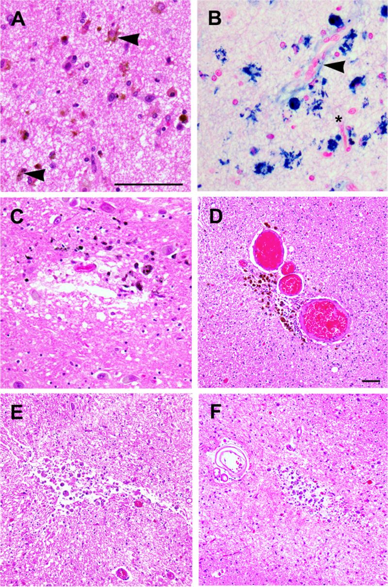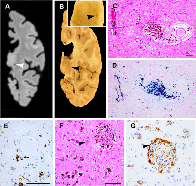 Abbreviations: CMBs - cerebral microbleeds; MHs - microhemorrhages; WM - white matter. MHs were acute, subacute or chronic based on the cellular response present. Acute MHs showed extravasation of erythrocytes through the walls of mainly arterioles and fewer venules and extended into the surrounding neuropil (Fig. 1C). Serial sectioning of the entire block did not show inflammatory cells or hemosiderin either on HE or the Perl’s Prussian blue stain thus their age was not altered (Fig. 1D). An additional finding in subacute MHs was the extension of red blood cells further from vessel walls than observed in the acute hemorrhages (Fig. 1G). A few intravascular and a variable number of perivascular macrophages were present and many contained faint brown hemosiderin pigment. The adjacent Perl’s-stained section accentuated the macrophage numbers and their hemosiderin content (Fig. 1H). The neuropil surrounding the hemorrhage showed vacuolation and sparse gemistocytes. In chronic MHs, a cavity was present containing or surrounded by a variable number of macrophages which showed intense brown cytoplasmic staining due to hemosiderin (Fig. 2C, D). The neuropil surrounding the hemorrhage showed fibrillary astrocytes. Adjacent arterioles showed acellular mural thickening with absence of smooth muscle cells and failed to show β-amyloid positivity (Fig. 2E). In all MHs, vessels failed to show mural β-amyloid positivity with the exception of one chronic MH (case 2, MH #3) in the midtemporal cortex which showed a disrupted vessel associated with hemosiderin-laden macrophages (Fig. 2F) and focal β-amyloid positivity at the periphery of the vessel (Fig. 2G). Another pattern of chronic MH was the presence of scattered hemosiderin-laden macrophages in a focal area of the white matter (Fig. 3A). Serial sectioning showed that these areas extended for depths of 120-180 μm and were related to terminal arterioles and capillaries (Fig. 3B). In some MHs, arterioles with sclerosed, hyaline walls and collapsed lumina were present surrounded by variable numbers of hemosiderin containing macrophages in the neuropil. In one instance, only perivascular collections of few macrophages were present in multifocal areas of the putamen. Figure 2: Ex vivo MRI scan, corresponding brain slab and microscopy of chronic grey matter hemorrhages are shown. (A) Ex vivo MRI shows a CMB in the lateral thalamus. (B) The corresponding brain slab shows an area of reddish discoloration (arrowhead) which is shown at higher magnification in the inset (case 2 MH#8). (C) The corresponding HE stained section shows a cavity containing hemosiderin-laden macrophages adjacent to an arteriole which shows focal mural disruption and double-barreling. A nearby arteriole shows perivascular hemosiderin-laden macrophages. (D) The adjacent section shows strong Prussian blue staining of the hemosiderin collections. (E) Immunostaining of the arteriole shown in C and D fails to show mural β-amyloid although the double barreling is highly suggestive of CAA. (F) A focal hemorrhage in layer three of the superior temporal cortex shows disruption of a vessel associated with hemosiderin-laden macrophages which are also present in the surrounding neuropil along with gemistocytes (arrowhead) (G) The adjacent section shows focal β-amyloid immunostaining at the periphery of the vessel (arrowhead). C, D scale bar = 50 μm; E, G scale bar = 50 μm, F scale bar = 50 μm. In addition to the MHs which correlated with the hypointense areas detected by ex vivo MRI, serial sectioning showed MHs measuring < 0.4 mm in their greatest dimension (Fig. 3C, D). These MHs were much smaller than the CMBs identified by ex vivo MRI and were present in 1-3 consecutive sections per block. These small MHs were not included in the total MH counts shown in Table 1, since they did not correlate with any of the reported hypointensities observed by MRI and since they were too small to be visualized by a 3T scanner. Although 38 CMBs were described in the ex vivo MR scans, in 8 instances microscopy did not show MHs despite additional slicing of brain slabs and microscopy of serially sectioned blocks. On microscopy, 3 of these presumed CMBs showed 2-3 large dilated vessels with luminal blood (Table 2). In 2 presumed CMBs, the area of hypointensity represented the site of entry of penetrating arterioles in the lateral and inferior portion of the putamen and in 2 presumed CMBs the area of hypointensity probably represented the depths of sulci and only in one case no pathology was detected. Additional pathology identified by serial sectioning were chronic microinfarcts in 2 cases and a subacute microinfarct in 1 case (Table 2) and microinfarcts measuring < 0.4 mm in their greatest dimension (Fig. 3E, F). Figure 3: Microscopy of chronic hemorrhages and chronic microinfarcts. (A) An example of a focal chronic white matter hemorrhage (600 x 300 μm) showing scattered hemosiderin-laden macrophages (arrowheads). (B) The adjacent section shows a terminal arteriole (arrowhead) and capillary (below the asterisk) with all macrophages showing positivity by the Perls’s Prussian blue stain. Serial sections show two small MHs (C, D) measuring 200 (C) and 300 (D) μm in their longest dimension and two chronic microinfarcts (E, F) measuring 300 (E) and 200 (F) μm which do not correlate with any CMBs observed in the ex vivo scans. The microinfarcts show disruption of the neuropil and many macrophages some of which appeared pale brown suggesting hemosiderin but were negative by the Perl’s Prussian blue stain. A-C scale bar = 50 μm; D-F scale bar = 50 μm. Discussion This study demonstrates the utility of ex vivo MRI in the identification of MHs by neuropathology assessment. Routine macroscopic assessment showed a total of 3 MHs while both macroscopic and microscopic assessment after ex vivo MRI showed about 12 times as many MHs. In cases 1 and 2, the number of MHs was increased from that seen on routine