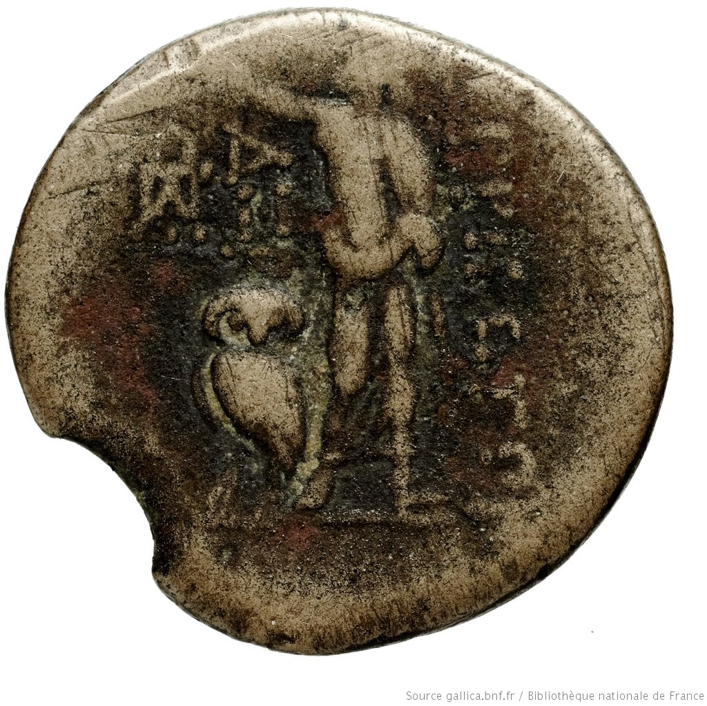 Abb. 4 (rechts): Revers einer Bronzemünze des Alexander I. Balas (SCO Nr. 1810). Athena steht frontal, hält in vorgestreckter rechter Hand eine Nike und stützt ihre linke Hand auf ihre Lanze. © Bibliothèque nationale de France, Inv. FRBNF41819245 (Bildnachweis: Gallica)